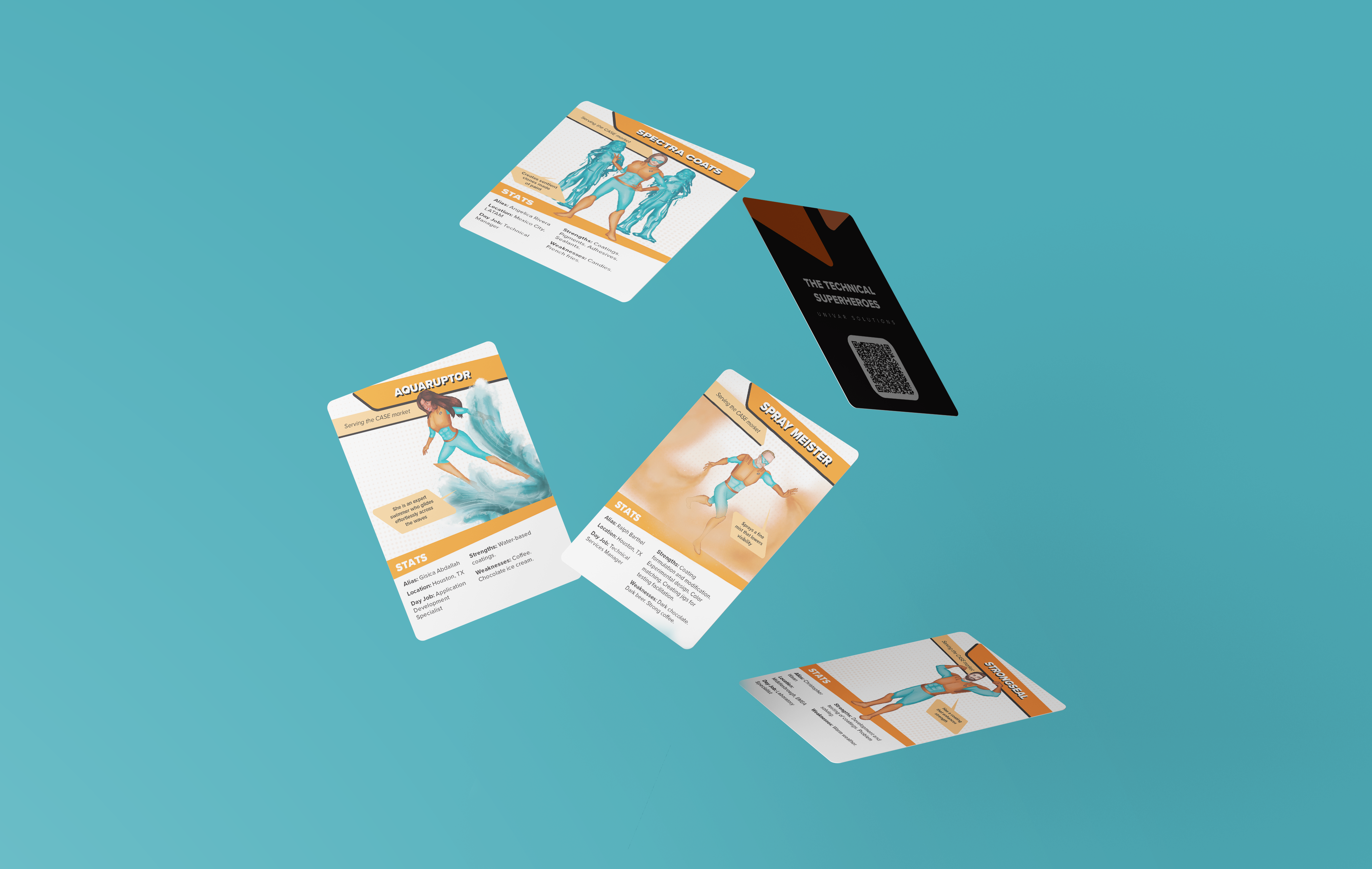 illustrative playful humanisticThe goal was to create graphic novel style promotional materials showing the range of talent and skill Univar Solutions brings to their clients. 35 people were transformed into superheroes with abilities based on their area of expertise in CASE and/or LMWF.